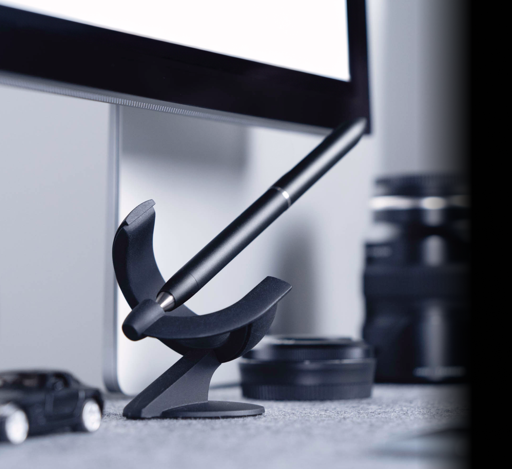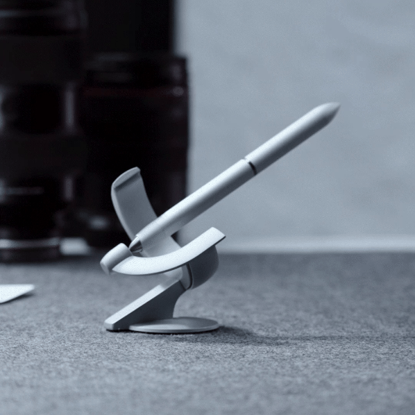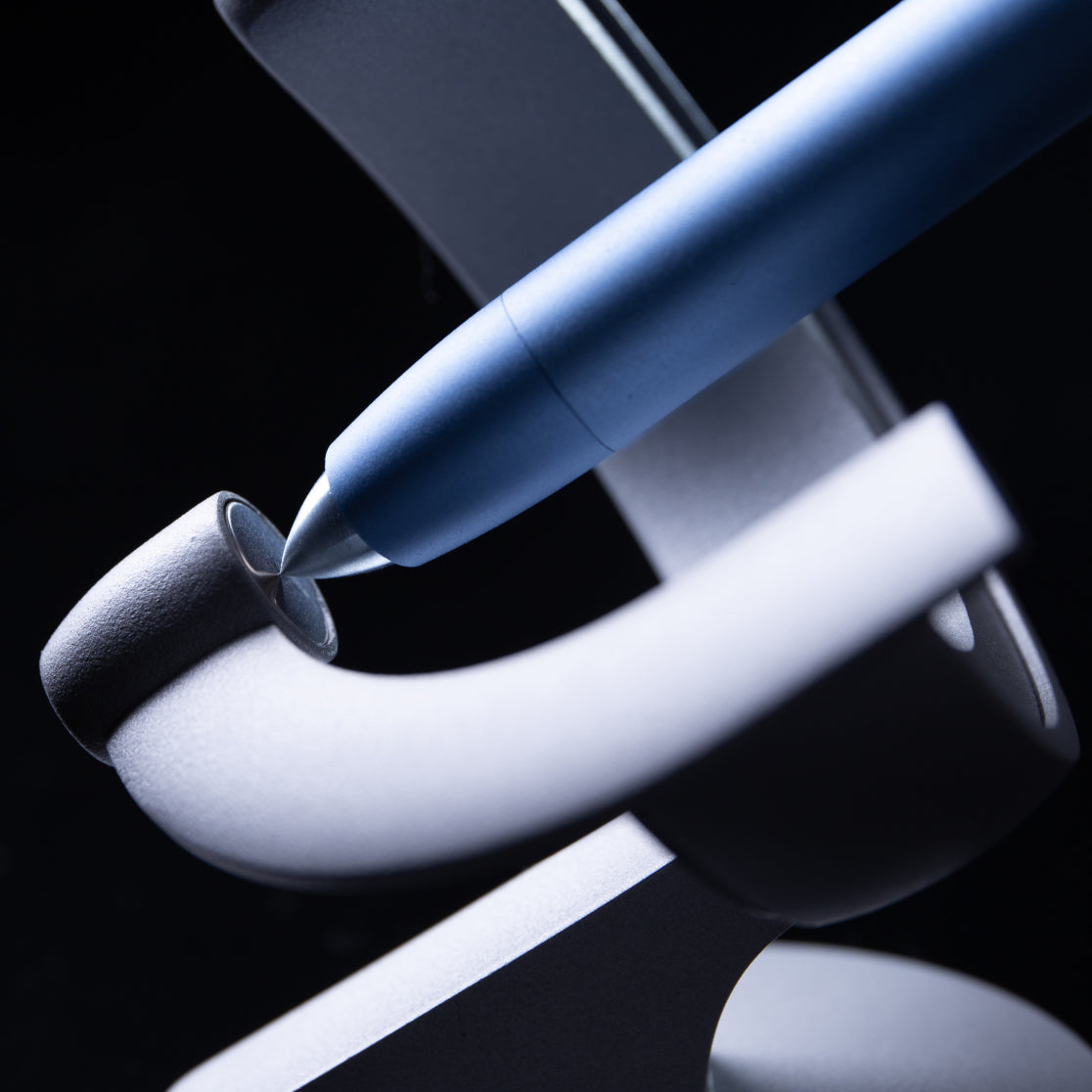 Every curve and angle of this futuristic fountain pen and its pedestal is precisely intentional, creating a functional art piece that transforms your space.