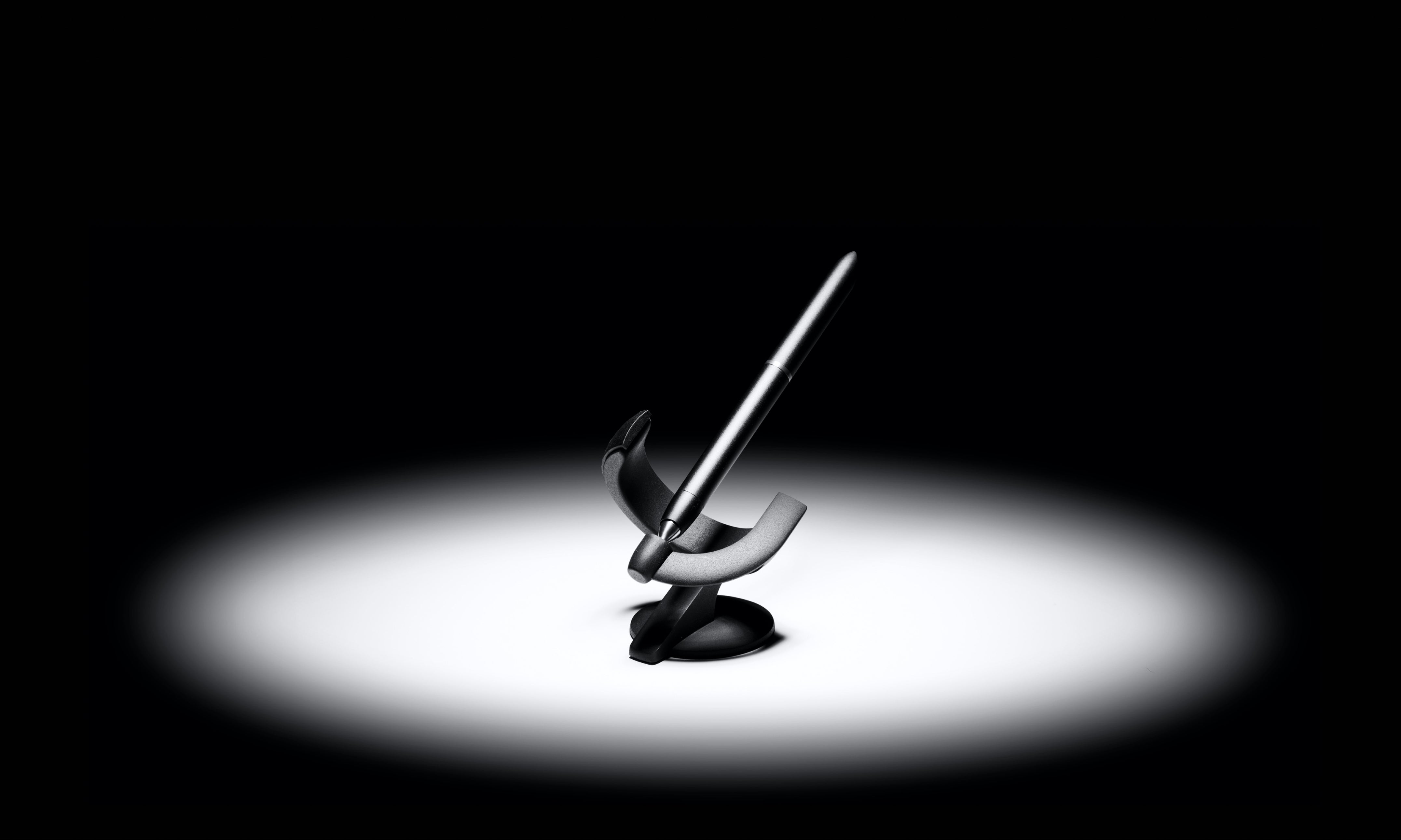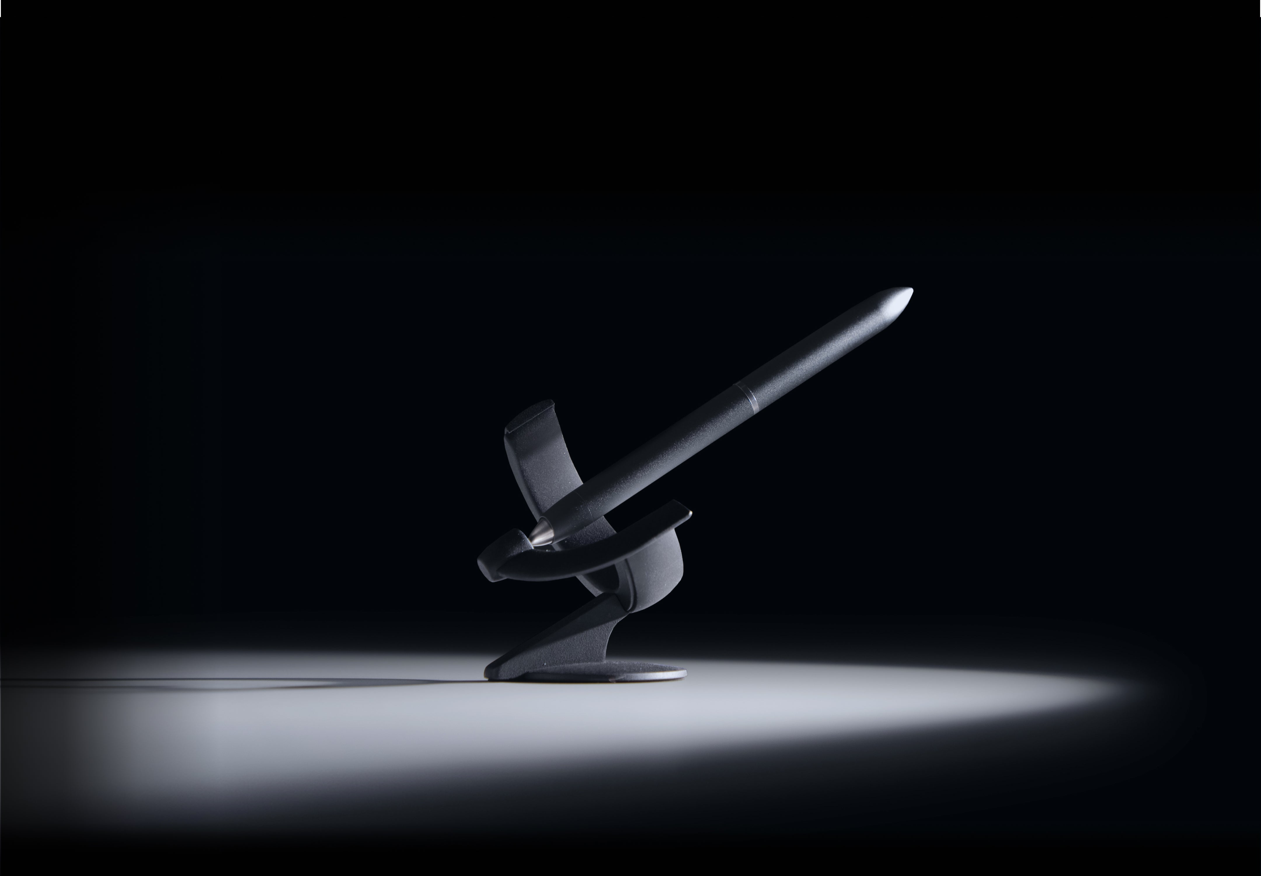 Every curve and angle of this futuristic fountain pen and its pedestal is precisely intentional, creating a functional art piece that transforms your space.
