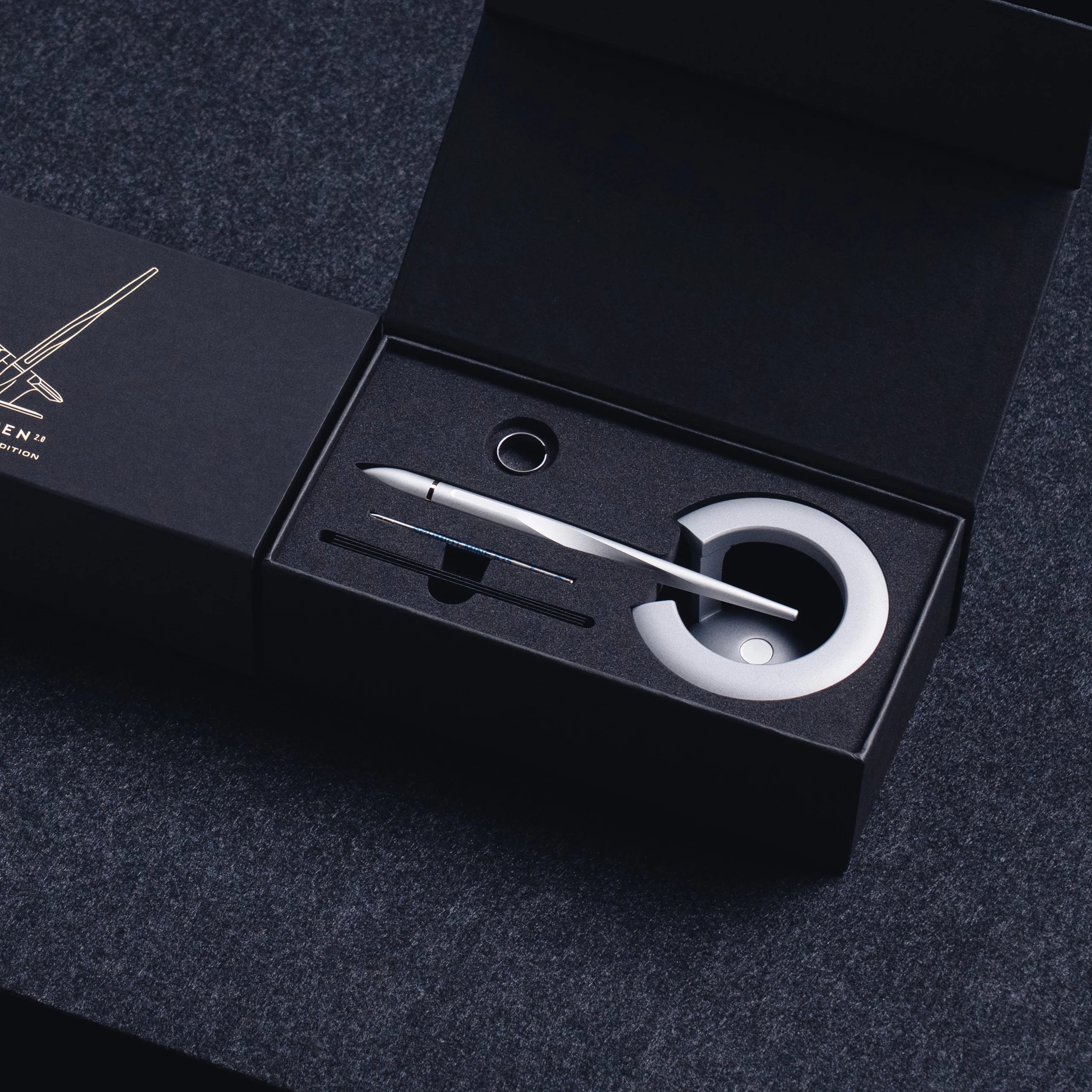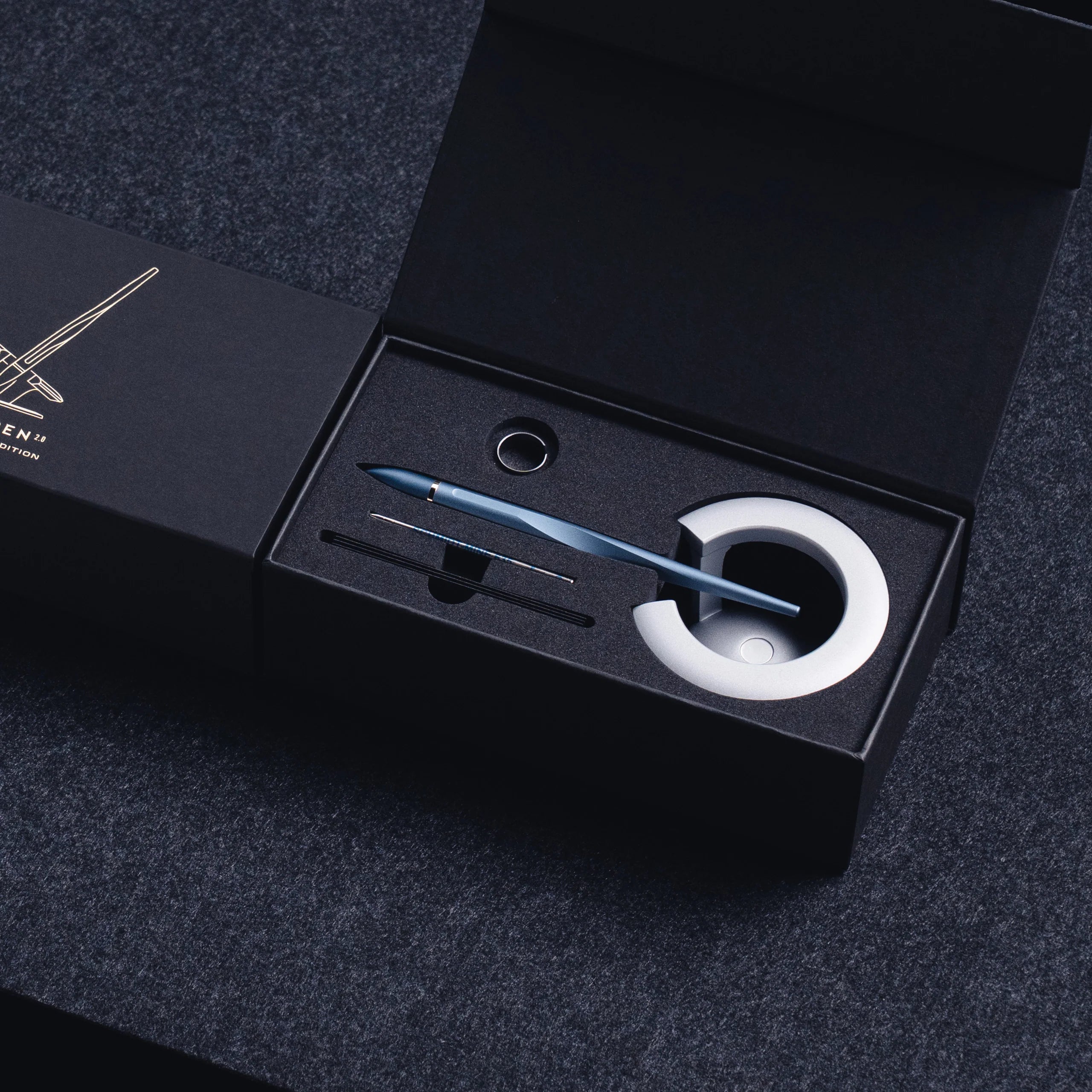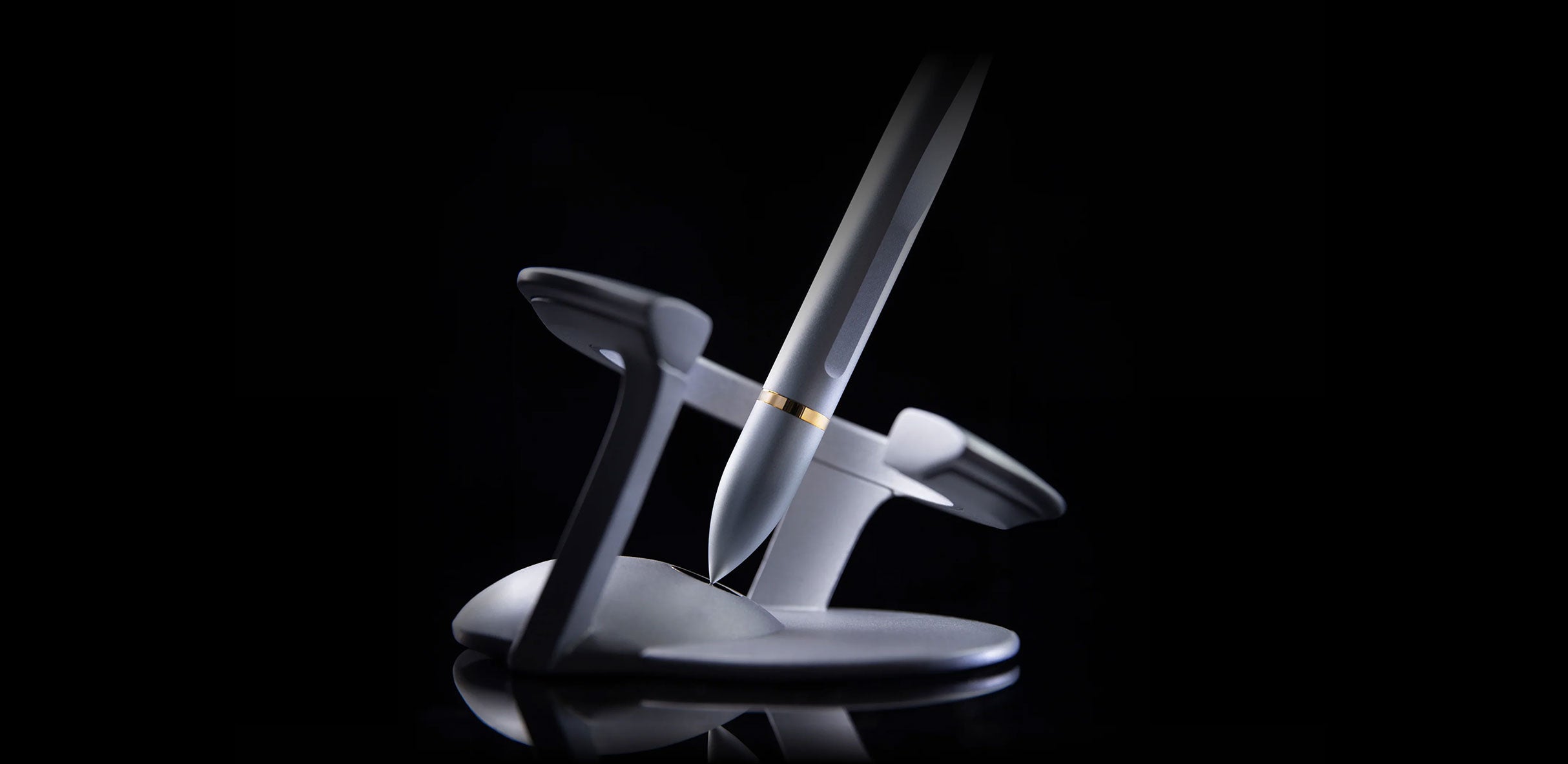 The original Hoverpen: a gravity-defying ballpoint pen crafted from aerospace-grade aluminum, designed to inspire every day.