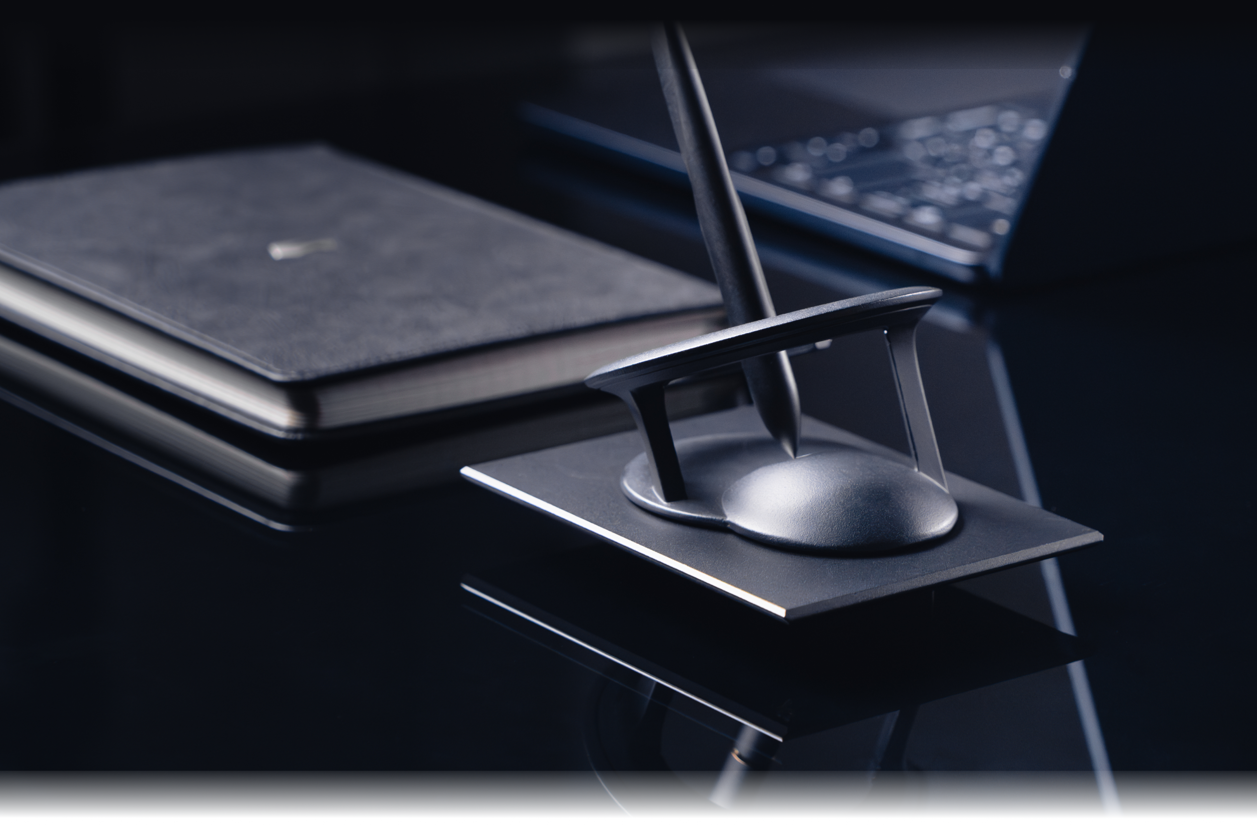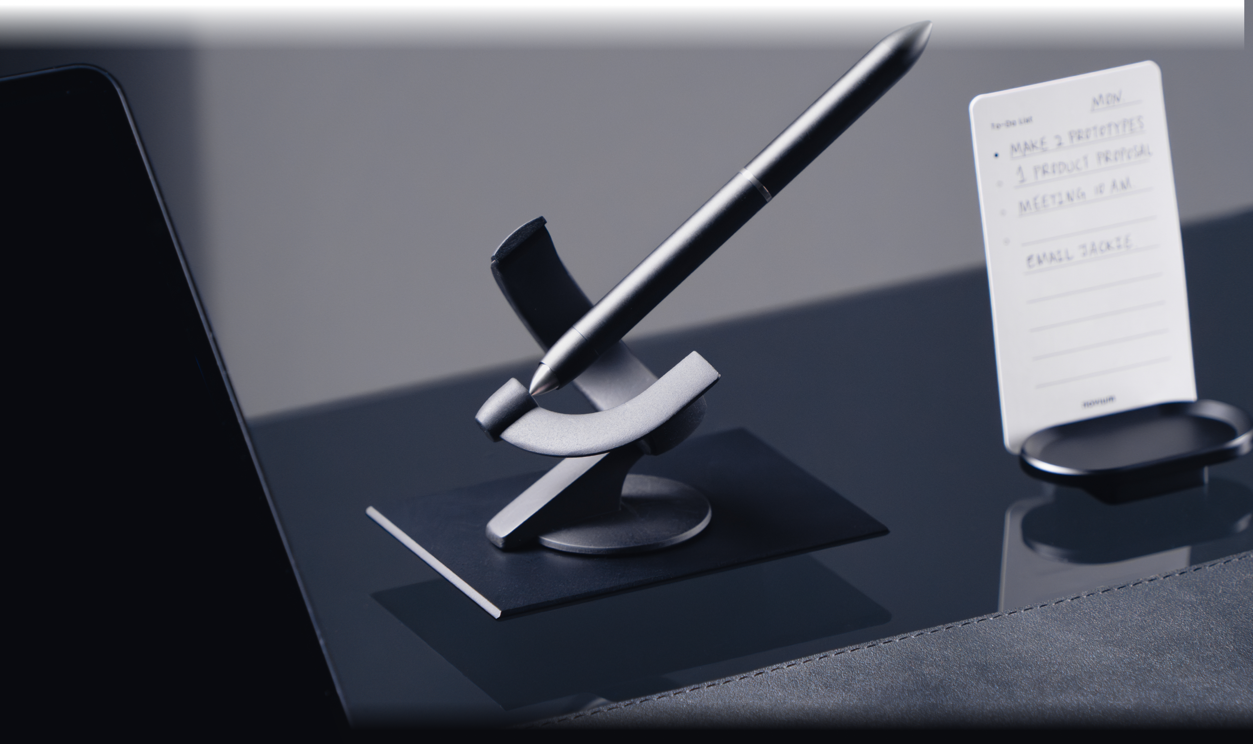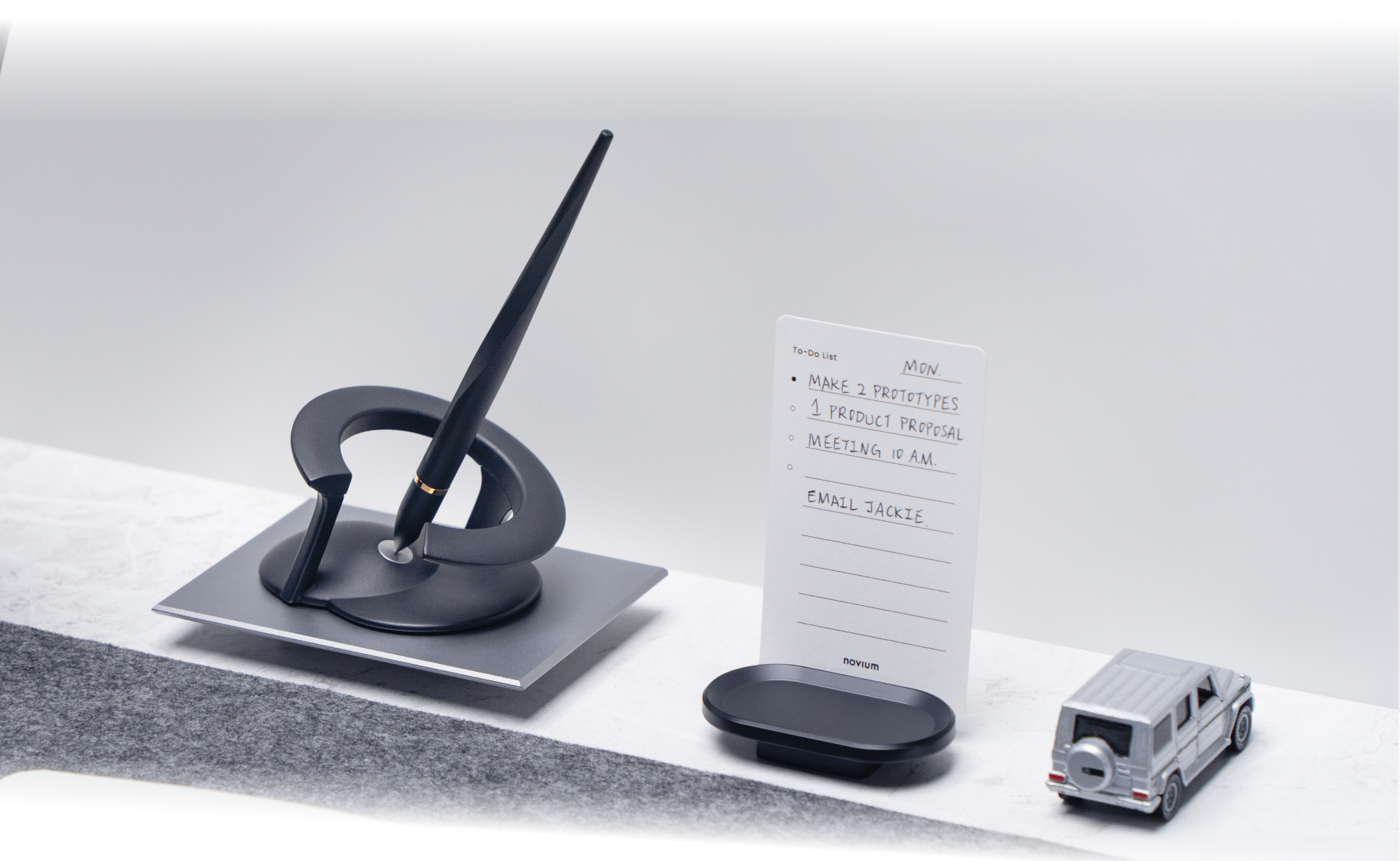 Evoking a sense of outer space at eye level, this inspired aluminum stand showcases the Hoverpen and desk essentials.